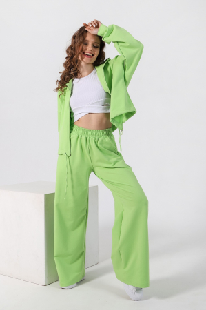 Костюм молодежный из гладкокрашенного трикотажного полотна «футер двунитка», состоящий из кофты и брюк. Куртка - свободного силуэта, с длинными втачными рукавами, с притачными манжетами, капюшоном и центральной бортовой застежкой на тесьму «молния». На рукавах по шву притачивания манжет выполнена сборка, низ изделия обработан в подгибку с вложением шнура, продернутым через две обметанные петли, на полочке принт, выполненный в технике «шелкографии». Брюки – свободного покроя расширенные книзу, на притачном поясе с эластичной тесьмой внутри и карманами в боковых швах.