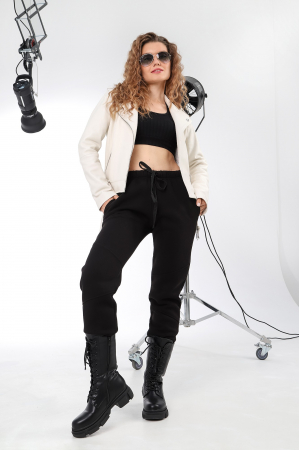 Брюки из трикотажного меланжированного полотна «футер-трехнитка», длинные, с карманами в боковых швах и эластичной тесьмой по талии. Передние половины – из трех частей каждая. Нижние срезы обработаны подгибкой с эластичной тесьмой. В подгибку верхнего среза через две обметанные петли для регулирования степени прилегания брюк по талии вставлен шнур, завязывающийся спереди.