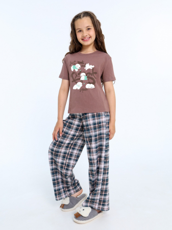 Костюм для девочки. Футболка базового покроя, с принтом. Брюки из полотна в клетку, расширенные к низу, с боковыми карманами, на притачном поясе с отстроченной эластичной тесьмой.