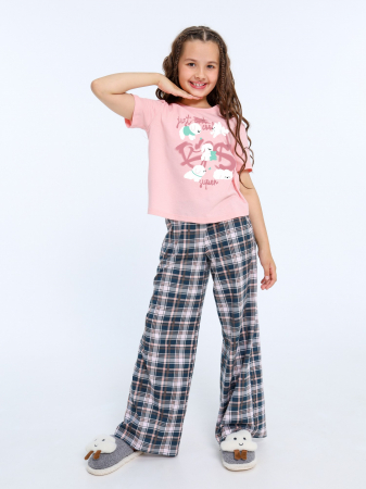Костюм для девочки. Футболка базового покроя, с принтом. Брюки из полотна в клетку, расширенные к низу, с боковыми карманами, на притачном поясе с отстроченной эластичной тесьмой.