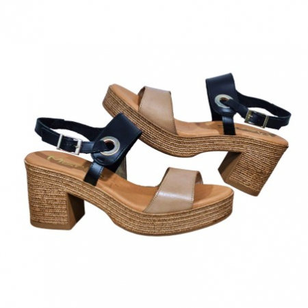 Sandalia para mujer con tacón medio elaborada en piel negro y Piel lino. El talón es descubierto y su cierre es en el tobillo mediante una hebilla metalizada lateral regulable que permite el ajuste perfecto.
