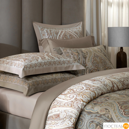 Ткань «Алькан» оформлена витиеватым восточным орнаментом со сложными переплетениями линий и множеством тонко выписанных деталей. Этот богатый узор привлекает приятным сочетанием кофейных оттенков, цвета какао с молоком и теплого терракотового. Такая комфортная палитра создает уютную, располагающую к отдыху атмосферу в спальне. Наволочка двусторонняя: с обратной стороны цвета узора меняются на противоположные.