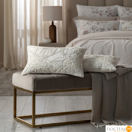 Изысканность подушке придает вышитый на ее поверхности флоральный орнамент, изящество которого подчеркивает ткань, напоминающая фактурное льняное полотно. Это контуры крупных цветов, созданные из хлопковых нитей и декоративного канта сливочного оттенка. Рельефный узор привлекает внимание своей выразительностью.