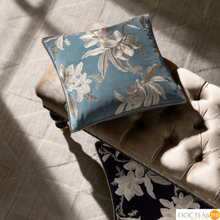 «Флорада» впечатляет роскошным флоральным орнаментом в классическом стиле. Это крупные цветы, вышитые гладью на бархатной ткани. Сложная вышивка с тонко воссозданными лепестками садовых цветов делает подушку очень нарядной. Классический дизайн завершает изящная отделка золотистым декоративным шнуром по периметру изделия. Нежный голубой цвет подушки подчеркивает изысканность вышивки в бежево-жемчужных с золотистым отливом оттенках. Эту модель можно дополнить коричневой подушкой «Флорада» из той же коллекции.