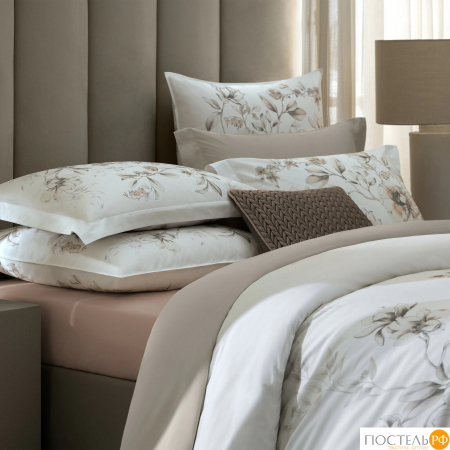 Наволочка оформлена флоральным принтом, словно выписанным тушью на белом фоне. Цветочный рисунок на ткани напоминает старинные ботанические гравюры с детально воссозданными прожилками на листьях и изгибами лепестков. Тонкие контуры цветов и легкие персиково-пудровые оттенки, которыми разбавлена бело-серая композиция, создают изысканный образ «Эверетт».
