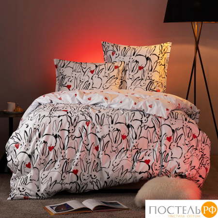 Постельное белье оформлено в игривом дизайне с изображением милых кроликов в черно-белых оттенках, что придаёт ему лёгкость и задор. Яркие красные сердечки на белом фоне добавляют акценты, создавая ощущение тепла и романтики. Такое сочетание цвета и стиля идеально подойдёт для создания уютной и жизнерадостной атмосферы в спальне.