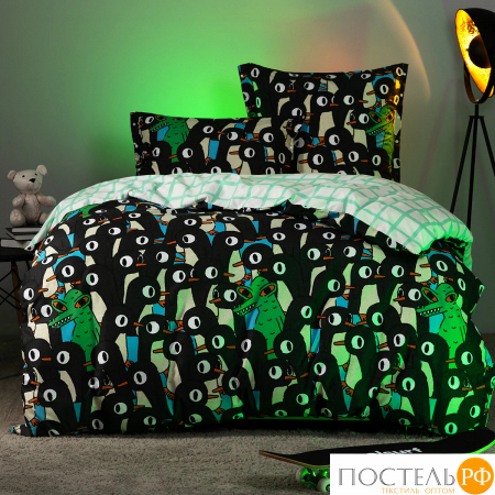 Постельное белье оформлено в ярком и игривом дизайне с изображением забавных персонажей: черных пингвинов и зеленых крокодилов, что создает атмосферу радости и веселья. Основной фон представлен в насыщенных черных, зеленых и бежевых оттенках, а ткань-компаньон с ярким узором в клетку добавляет комплекту легкость и динамичность. Этот оригинальный стиль станет ярким акцентом в интерьере, привнося нотку креативности и игривости в вашу спальню.