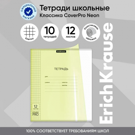 Тетрадь 12 листов в клетку, ErichKrause «Классика» CoverPrо Neon, пластиковая обложка, жёлтая (арт. 7800920)