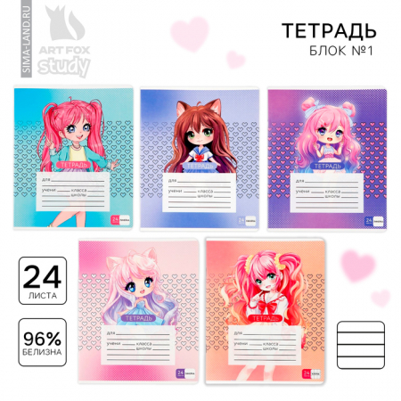 Тетрадь в линейку, 24 листа, А5, на скрепке, блок №1 «Аниме» МИКС (арт. 10177047)