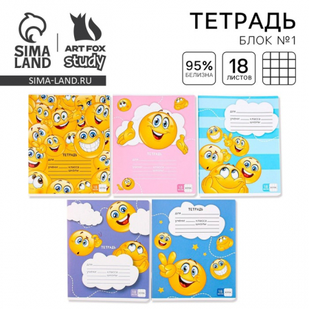 Тетрадь в клетку, 18 листов, А5, на скрепке, блок №1«Смайлы» МИКС (арт. 9413697)