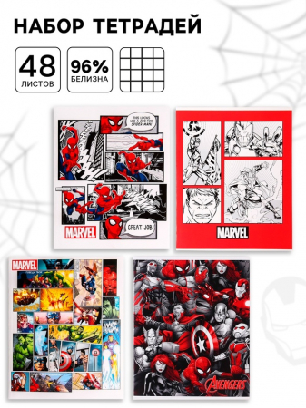 Тетрадь 48 листов, 4 шт. в клетку, обложка мелованный картон, «Мстители» (арт. 9827381)
