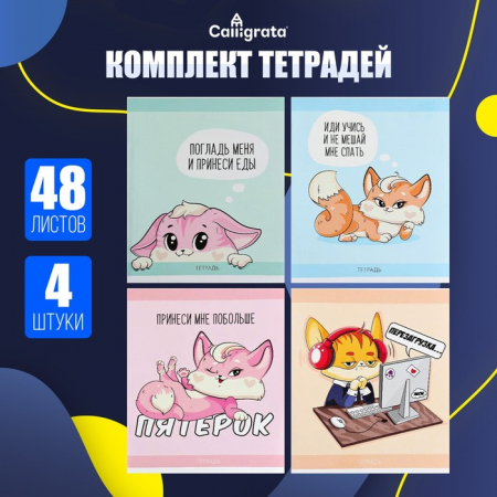 Комплект тетрадей из 4 штук, 48 листов в клетку Calligrata Лисички, обложка мелованная бумага, блок №2, белизна 75% (серые листы) (арт. 7726070)