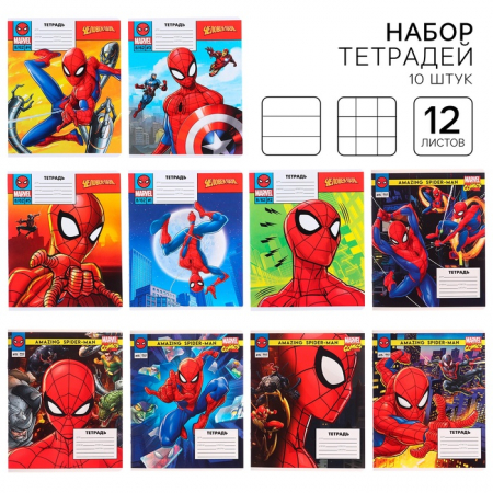 Тетрадь 12 листов, 10 шт. в клетку, 10 шт. в линейку, Человек-паук (арт. 10516362)