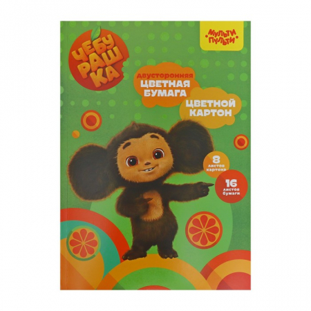 Набор цветного картона А4 8 листов (немелованный) и цветной бумаги 16 листов (газетная, двусторонняя) Мульти-Пульти "Чебурашка", на склейке (арт. 9854516)