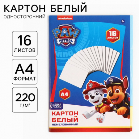 Картон белый, А4, 16 листов, немелованный, односторонний, в папке, 220, г/м?, «Щенячий патруль» (арт. 4437467)