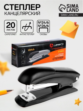 Степлер № 24/6, 26/6, Lamark Ulrich, встроенный антистеплер, индикатор скоб, до 20 листов, металлический корпус, чёрный (арт. 1419931)