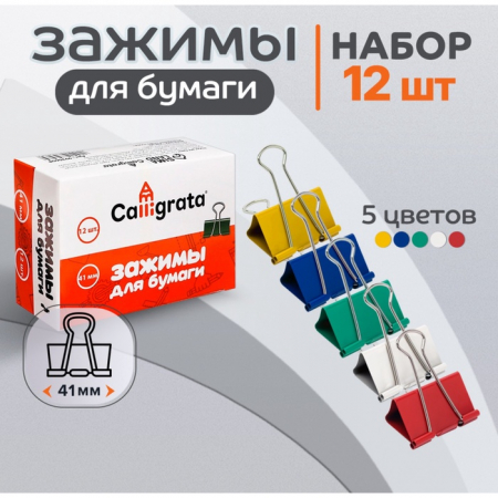 Набор зажимов для бумаг цветных 41 мм, 12 штук, 5 цветов, в картонной коробке (арт. 9935608)