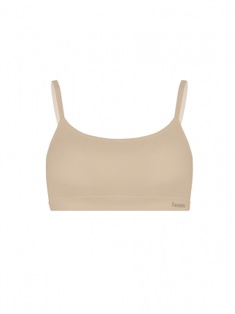 Бюстгальтер-топ из эластичного рибового полотна в вертикальный рубчик с мягким подкладом и съемными вкладышами. Без каркасов и боковых корсетных вставок. Регулируемые не съемные тонкие бретели.. Брендированная лента под грудью.