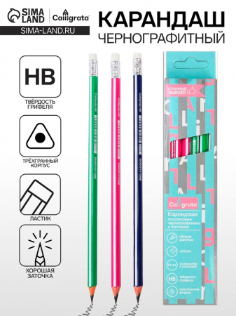 Карандаш чернографитный, Calligrata, HB, заточенный, трёхгранный с полоской, с резинкой, пластик, МИКС (арт. 5101398)