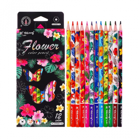 Карандаши 12 цветов в картонной коробке, шестигранные, деревянные,Цветы на чёрном МИКС (арт. 10553285)