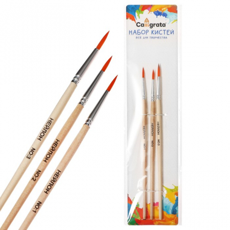 Набор кистей синтетика 3 штуки (круглые: №1,2,3) с деревянными ручками, на блистере (арт. 10212703)