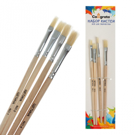 Набор кистей, щетина, плоские, 4 штуки: № 1, 2, 3, 4, с деревянными ручками, на блистере (арт. 1503505)