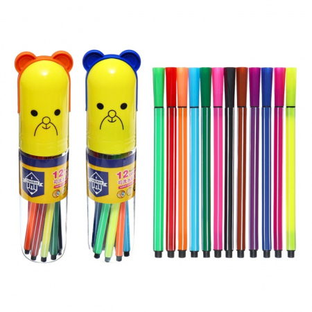 Фломастеры 12 цветов «Мишка/Киска», в жёлтом тубусе, полоски на фломастере (арт. 10517906)