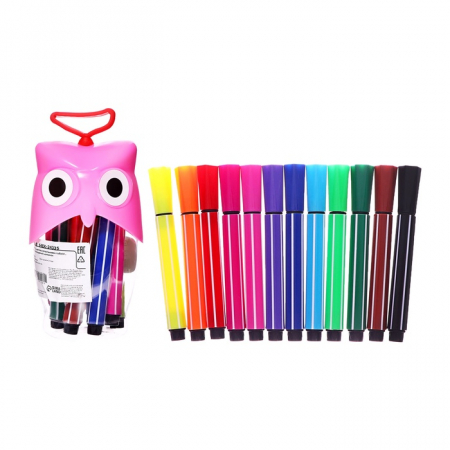 Фломастеры 12 цветов в пластиковом тубусе Сова розовая, ТОЛСТЫЕ вентилируемый колпачок (арт. 10710128)