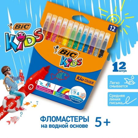 Фломастеры 12 цветов BIC Kids Visa, детские, смываемые, тонкое письмо (арт. 1354855)