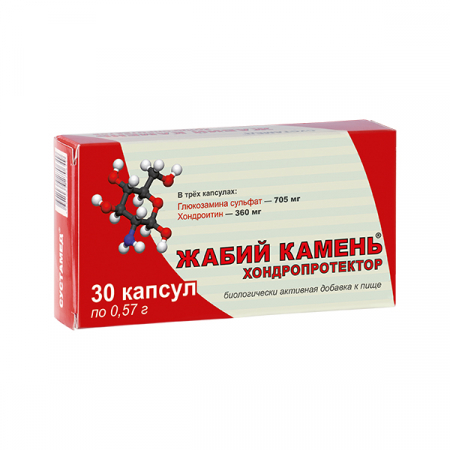 «Жабий камень» хондропротектор - биологически активная добавка, которая содержит Глюкозамина сульфат и хондроитина сульфат и оказывает регенерирующее, тонизирующее и противовоспалительное действие на ослабленный организм. Она может использоваться как вспомогательное, так и как профилактическое средство при лечении любых травм и нарушений работы суставов, мышц и костей.