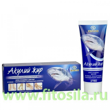 Акулий жир с конским каштаном и корой ивы снимает напряжение в мышцах и устраняет болевые ощущения в ногах, улучшает микроциркуляцию крови, придает эластичность стенкам венозных сосудов, тонизирует вены, уменьшает хрупкость капилляров и проявление сосудистых "звездочек", снимает отеки и синяки, предупреждает образование тромбов в кровеносных сосудах и способствует рассасыванию образовавшихся тромбов.