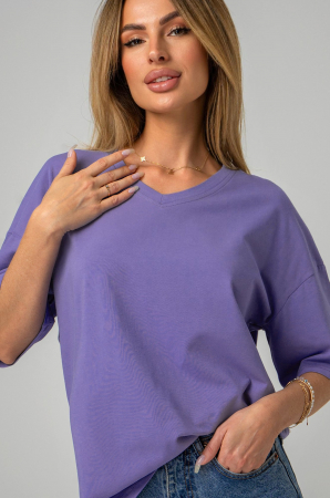 Женская футболка с v-вырезом добавит комфорта в любой день. Однотонная футболка оверсайз сиреневого цвета выполнена из хлопка с эластаном. Oversize-крой дарит свободу и расслабленный силуэт. Спущенная линия плеча не стесняет движений и создаёт чувство лёгкости.