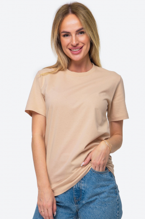 Однотонная женская футболка – тот случай, когда не нужно придумывать, что надеть. Бежевая футболка универсальна. Классическая модель с коротким рукавом выполнена из натурального 100% хлопка.