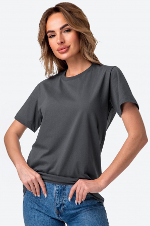 Однотонная женская футболка – тот случай, когда не нужно придумывать, что надеть. Темно-серая футболка универсальна. Классическая модель с коротким рукавом выполнена из натурального 100% хлопка.