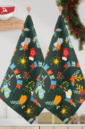 Новогодний комплект кухонных полотенец с петельками выполнен из рогожки – натурального 100% хлопка. В наборе представлены два полотенца с рисунком Варежки на тематику зимних праздников.