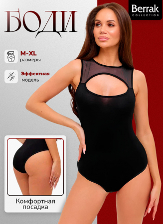 Классическое боди Berrak черного цвета на широких бретельках из сетчатой ткани, которые соединяются с боди в виде овала на груди. Застежка на крючках.