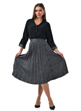 На фотографии представлен женский костюм-двойка, состоящий из черного блузона с длинными рукавами и V-образным вырезом, который застёгивается на пуговицы, и юбки в полоску. Юбка имеет среднюю длину и прямой крой. Цветовая гамма костюма включает оттенки серого и черного, что придаёт ему стильный и современный вид. Этот костюм отлично подойдёт как для офисного, так и для повседневного образа.