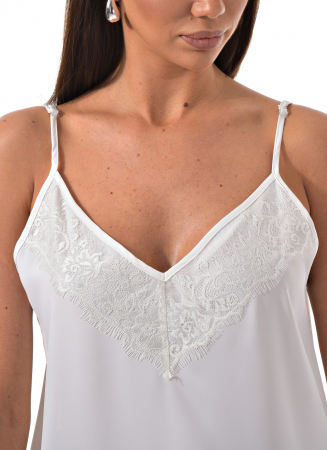 Изысканный дизайн: топ выполнен в белом цвете с изысканными кружевными вставками, которые придают ему особый шарм и элегантность.