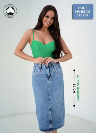 Длина юбки составляет 80 см, а длина разреза — 24 см. Рост модели на фотографии — 173 см, параметры — 89-62-93. Размер модели — 25.