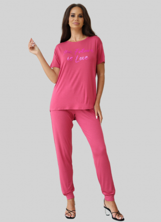Женский комплект Sevim цвета фуксии: футболка свободного кроя с надписью и обтягивающие штаны. Комплект изготовлен из 100% вискозы.