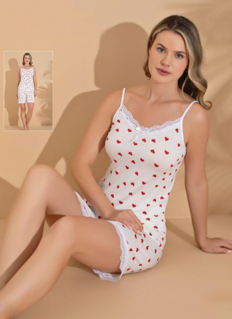 Комплект состоит из майки на тонких бретельках и шортиков. Украшен кружевом.