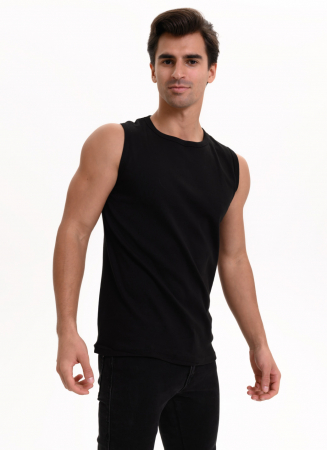 Мужская майка Berrak черного цвета на широких лямках. Приталенная, плотно держится на фигуре. Классическая спина. Майка изготовлена из 100% хлопка рибана.