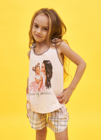 Комплект состоит из майки на широких бретелях, и коротких шортиков, украшенных небольшим воланом.