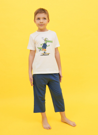 Стильный и уютный комплект домашней одежды приятных оттенков без утеплителя и начеса. Подойдёт как домашняя одежда, для сна и отдыха. Комплект состоит из футболки с коротким рукавом и удлиненных шорт, выполненных из мягкого трикотажа.
