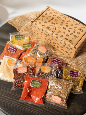 Подарочный набор специй включает в себя следующие приправы и специи: -приправа для шашлыка -приправа для плова -приправа для курицы -копченая паприка -паприка -лимонный перец -чеснок -базилик -хмели-сунели -приправа 6 перцев -универсальная приправа -итальянская приправа -пажитник. В подарочный набор входит 13 специй по 40 грамм