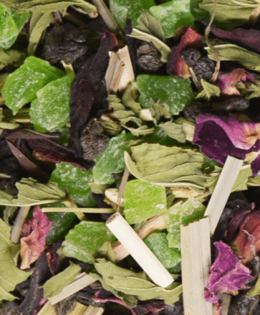 Купаж на основе традиционного китайского чая Сенча с добавлением цукатов, лимонной травы, листьев мяты и сафлора. Содержит пищевые ароматические масла. Идеально для приготовления холодного осежающего чая.