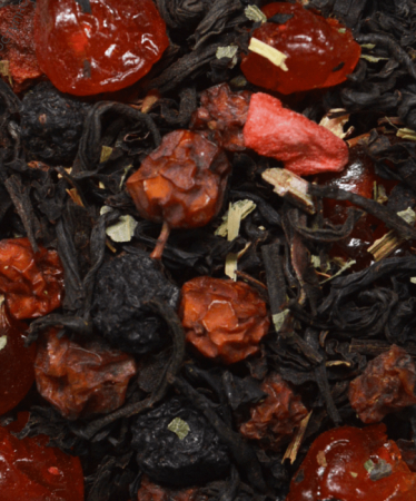Состав: черный индийский чай, ягоды красной и черной смородины, вяленой вишни, чабрец, ромашка, аромамасла