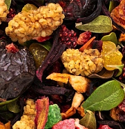Красный чай каркаде, нарезанный и обогащенный цукатами манго, ананаса и папайи, кусочками сушеного яблока, сублимированной клубники, ягодами годжи, плодами шелковицы, апельсиновыми сегментами и листьями брусники. Продукт содержит натуральные ароматические масла.