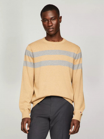Tommy Hilfiger men's sweater. A double stripe print adds a bit of varsity cool to our premium combed-cotton sweater. Cut in an easy fit, it's perfect for layering or works well on its own.