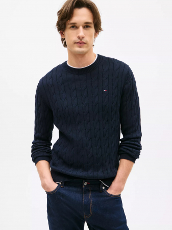 Tommy Hilfiger men's sweater. Made from soft cotton in a textured cable knit weave, this crewneck sweater is the perfect layer, complete with rib-knit cuffs, collar and hem with touches of subtle branding throughout.